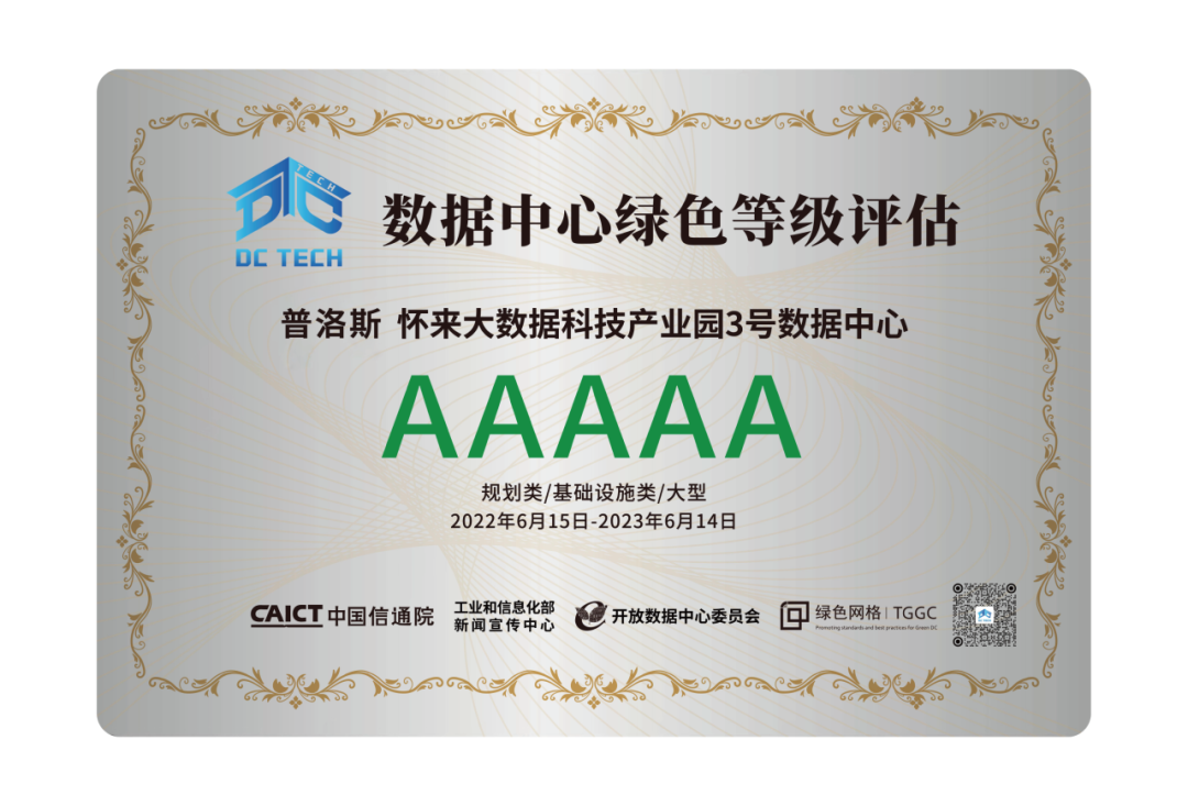 普洛斯懷來數(shù)據(jù)中心3號(hào)樓獲得由開放數(shù)據(jù)中心委員會(huì)(ODCC)頒發(fā)的“數(shù)據(jù)中心綠色等級(jí)評(píng)估”5A級(jí)認(rèn)證,并通過國際權(quán)威的Uptime M&O(運(yùn)維與管理)認(rèn)證