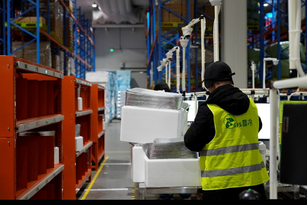 “第一次及每一次都把事情做對。”這是普冷廣州增城物流中心庫內墻上的標語,也是普冷一直以來的信念。記者穿戴好防寒衣服,跟隨普洛斯及租戶員工代表進入普冷庫。庫內分為冷凍區、冷藏區、變溫區、穿堂(備貨)區,其中冷藏區和穿堂區是工作人員活動的主要區域,在這里完成冷鏈食物的分揀和包裝。